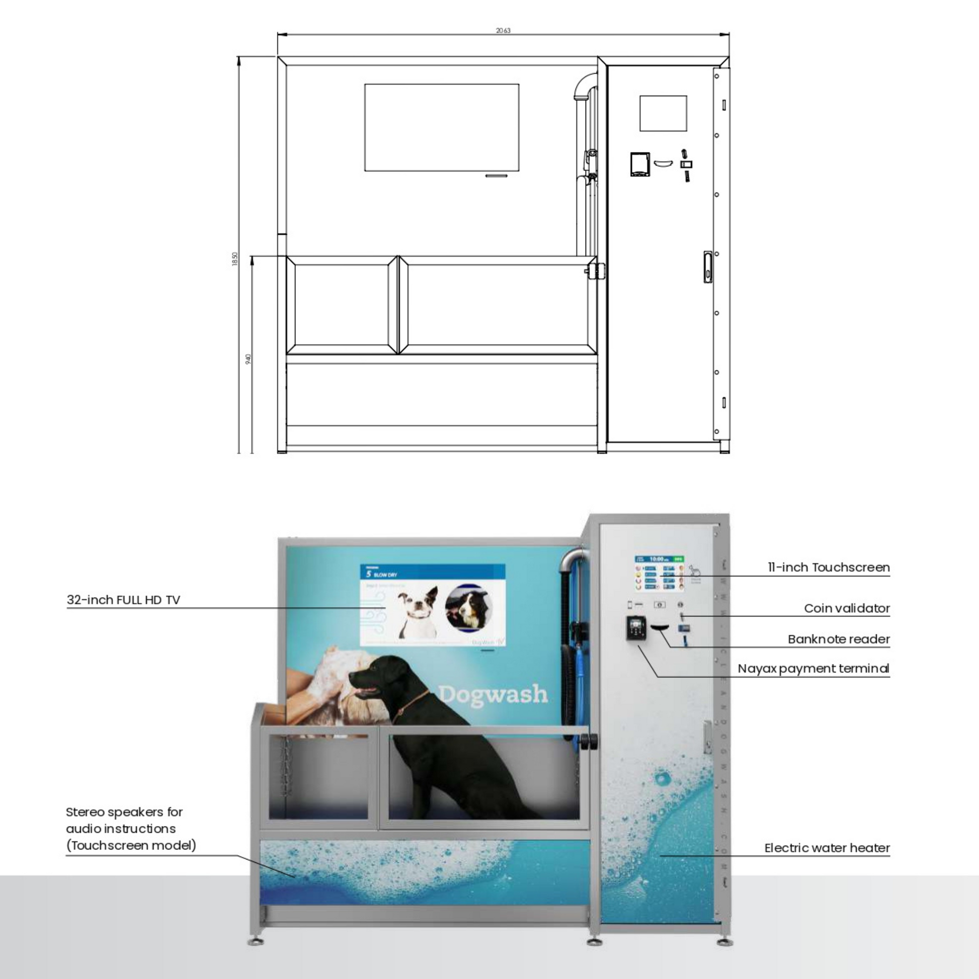 Improved and redesigned the original Dog Wash and updated it with car wash-quality components and an 11-inch touchscreen (iPad size) and a 32-inch Full HD TV with a lot of extra features.